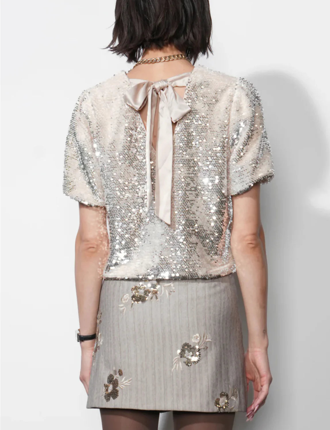 It features a high, structured neckline and a sophisticated, sleeveless cut. The entire garment is adorned with shimmering sequin embellishments that are concentrated to create a beautiful texture and light-catching sparkle. The key design feature is the bubble hem—a slightly voluminous, gathered bottom that creates a flattering and modern shape when tucked or left untucked.
