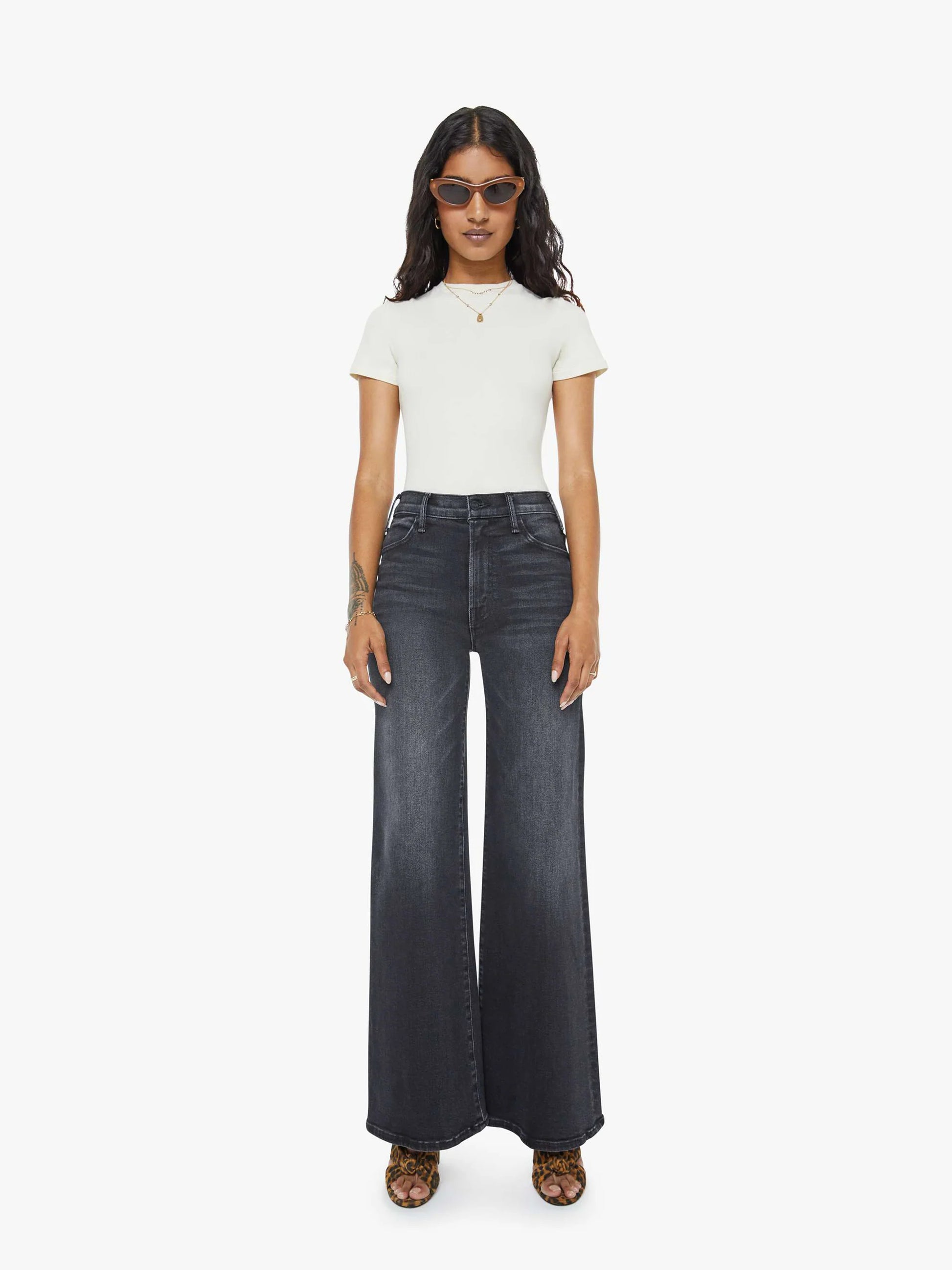 70s-inspired wide leg jeans with a high rise, 30-inch inseam and a clean hem. Designed in a stretch cotton blend, Not Today Satan is a black wash with whiskering, fading and tonal hardware.