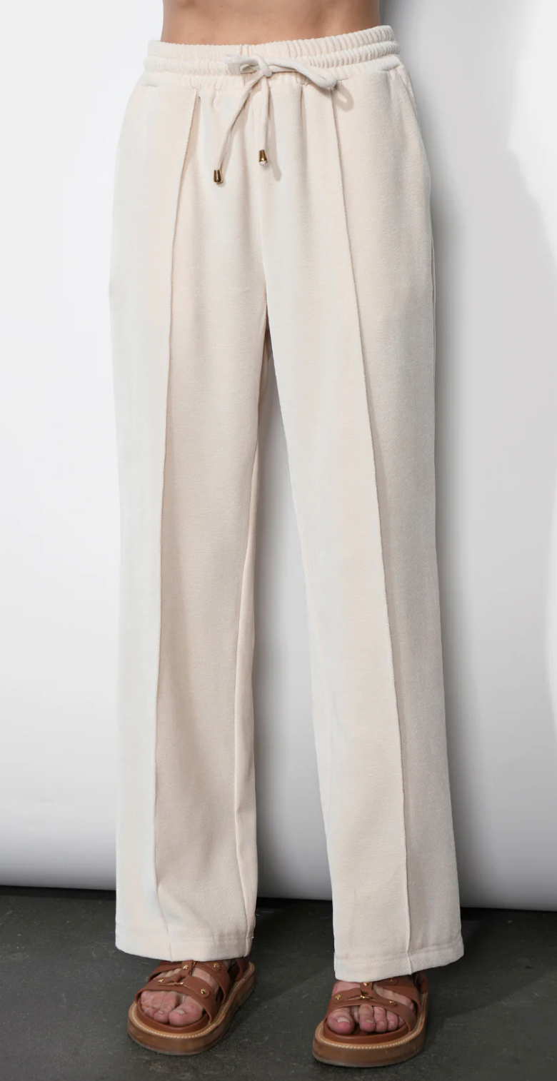 Presented in a soft Cream color, these pants offer a clean, relaxed aesthetic. Crafted from a comfortable, soft fabric, they are designed with a relaxed fit throughout the leg and feature a functional drawstring waistband for an adjustable and cozy feel.