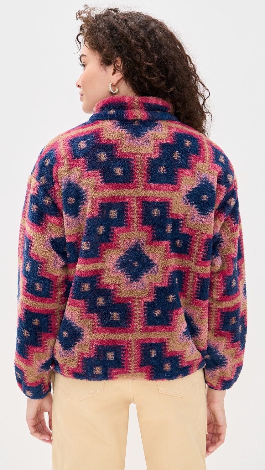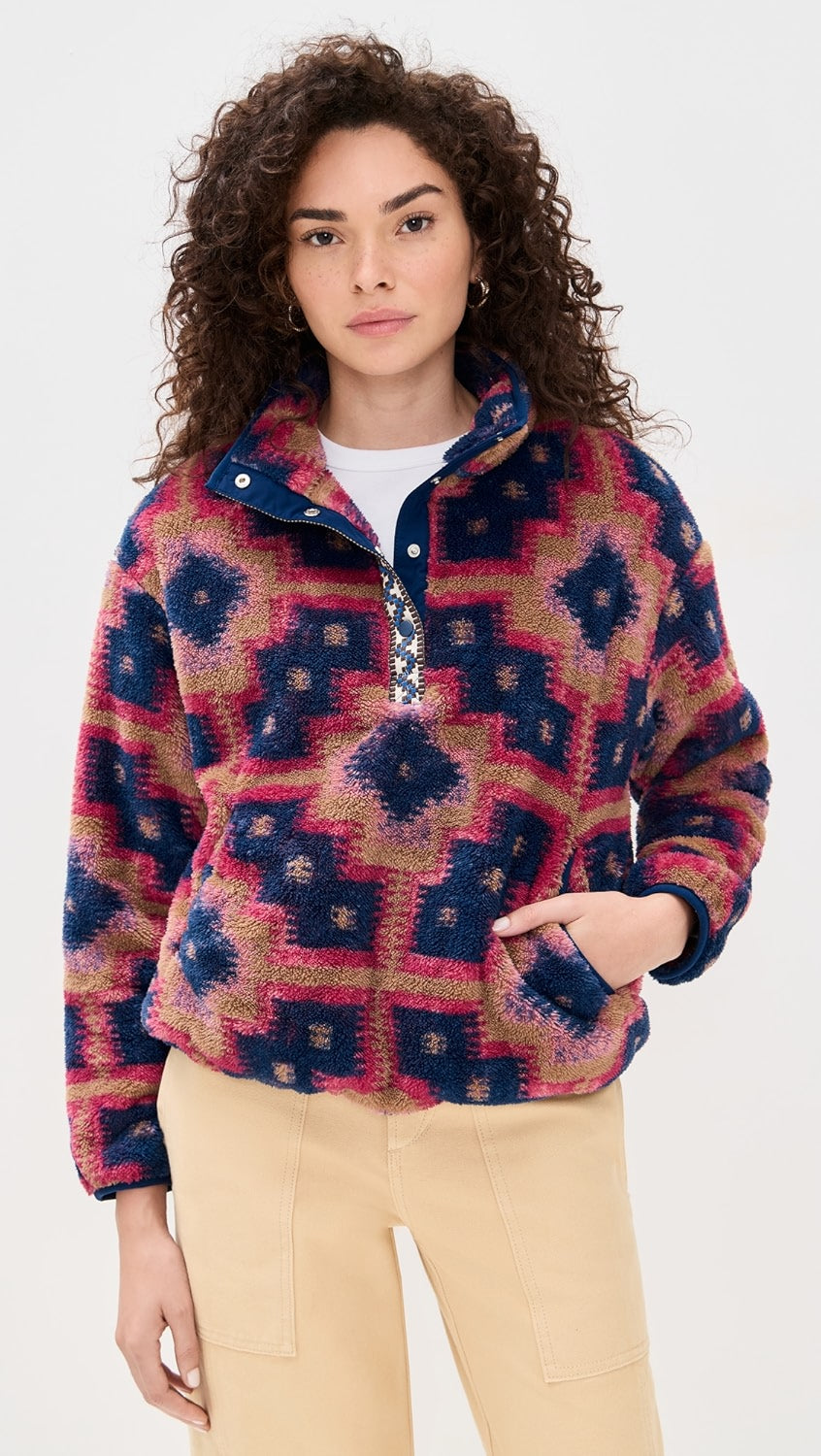 Make a (Cozy) Statement. Ridge is new this season in our mosaic tile polar fleece. This relaxed fleece pullover features a contrast embroidered tab detail, snap button-front, and side pockets.