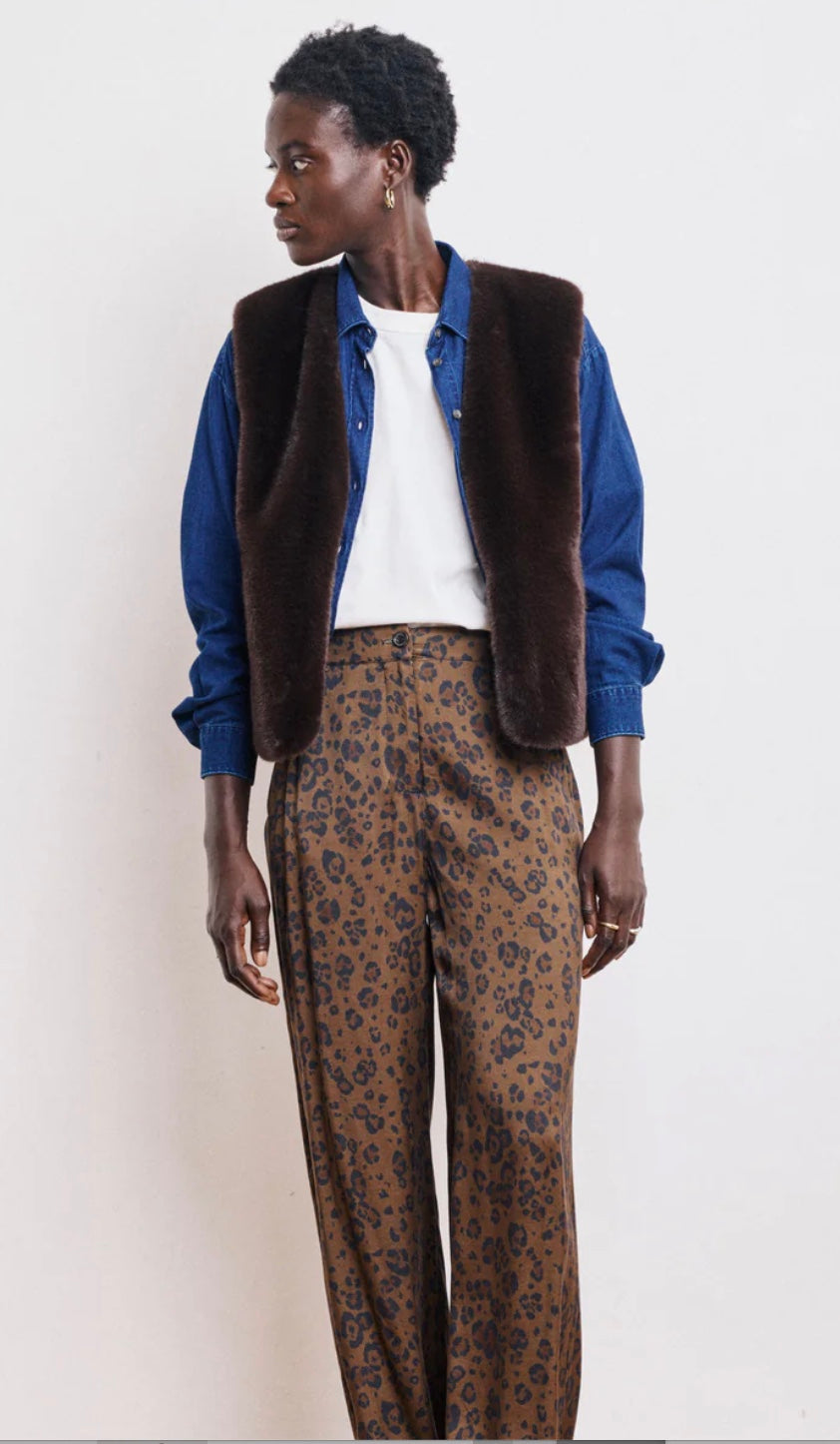 Sleeveless faux fur vest for women. V-neck and three-hook closure. Two bias pockets. Exclusive jungle print lining.
