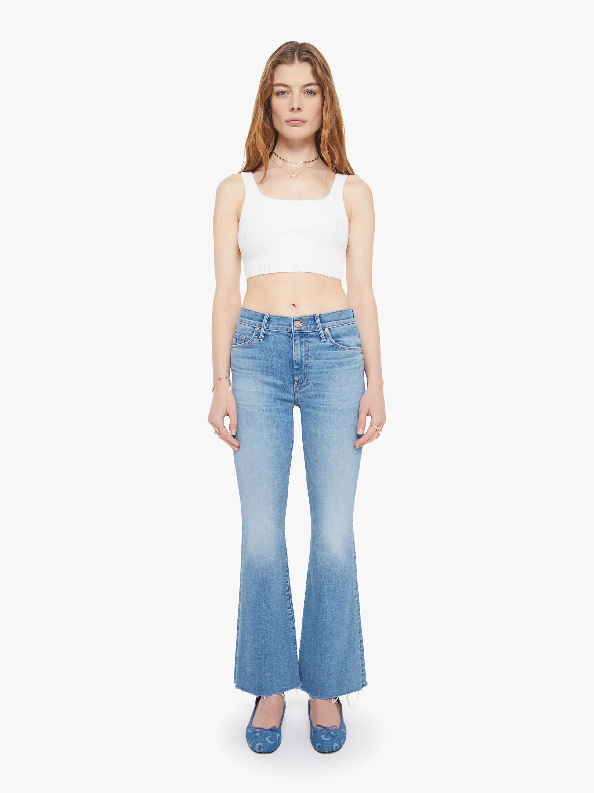 Full throttle. Our most popular mid-rise flare has a zip fly, 32.25-inch inseam and a frayed hem. Made from a blend of recycled stretch denim, Ride Hard Live Louder is a light blue with subtle whiskering and fading at the knees.