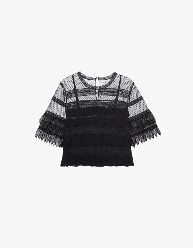 Whimsical and light, these top layers dotted mesh, bobbin lace, and tiers of soft georgette ruffles for a vintage-inspired feel. With delicate edges and a loose, boxy shape, it moves beautifully with every step. Sheer and airy, it’s finished with a button closure at the back and comes with a separate camisole.